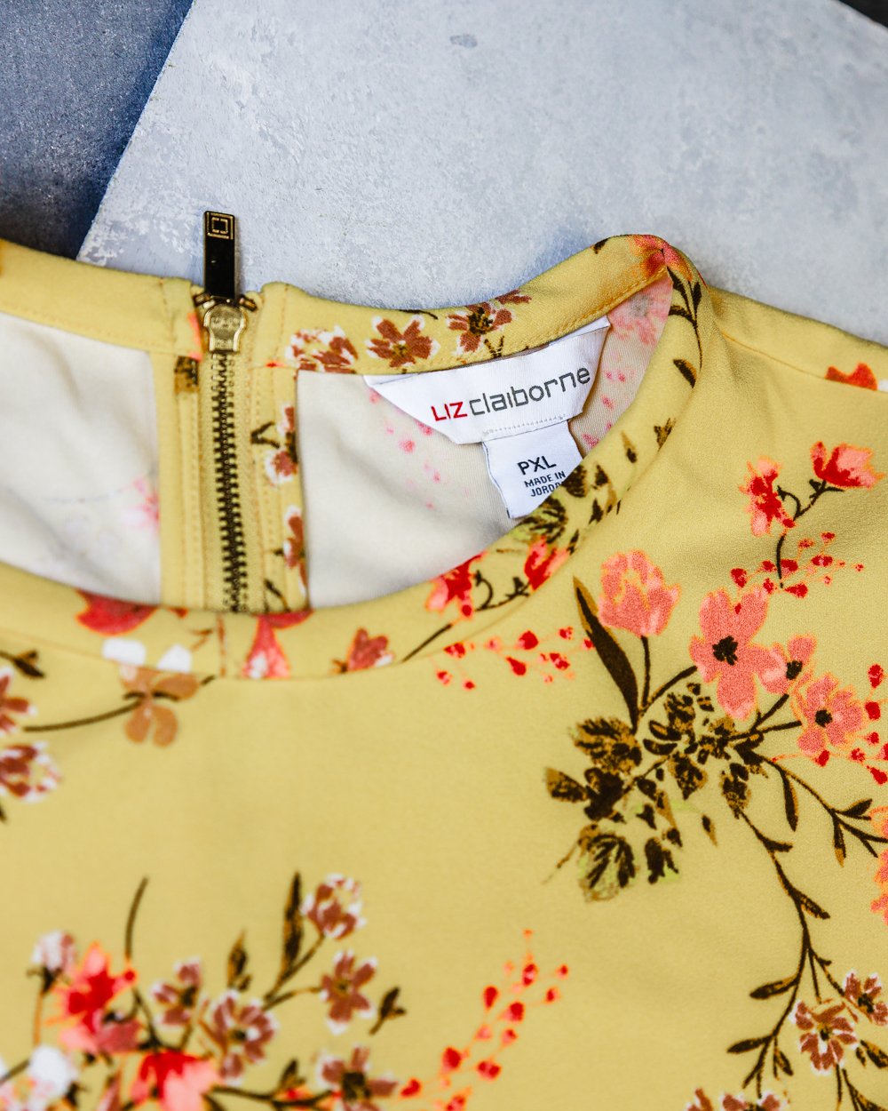 SS-BV-PXL-06 Blusa de Vestir Amarilla con Flores, Mangas Cortas, Size Petit XL, Liz Claiborne