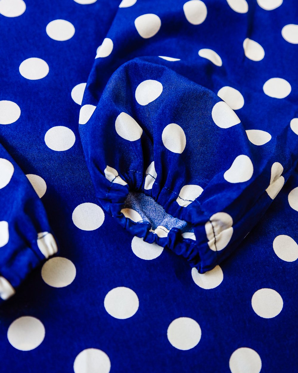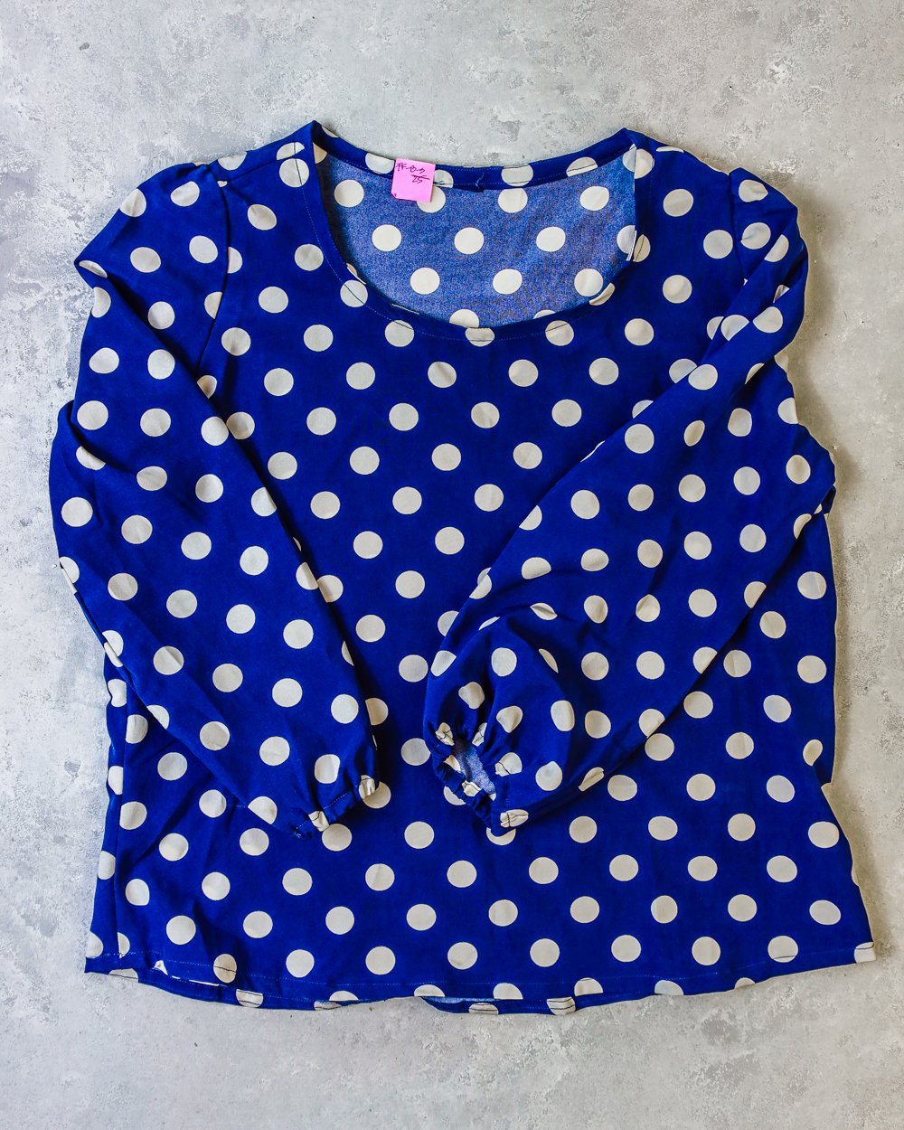 FF-BV-L-23 Blusa Azul con Puntos Blancos, Cuello Redondo, Mangas Largas, Size L