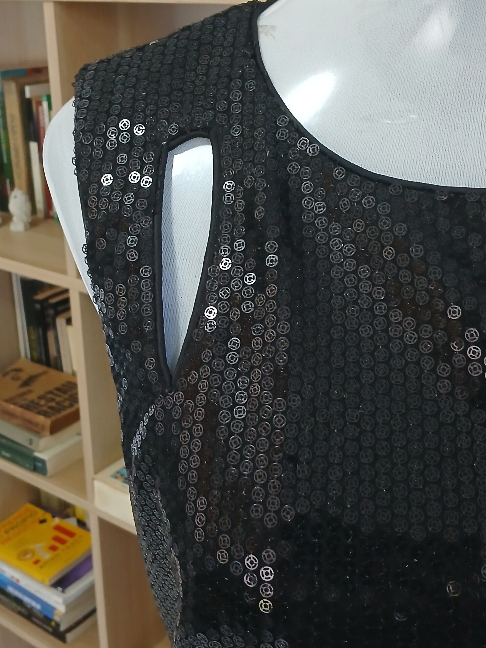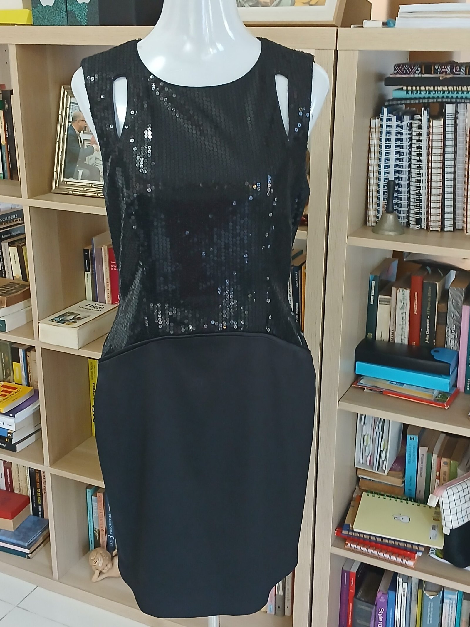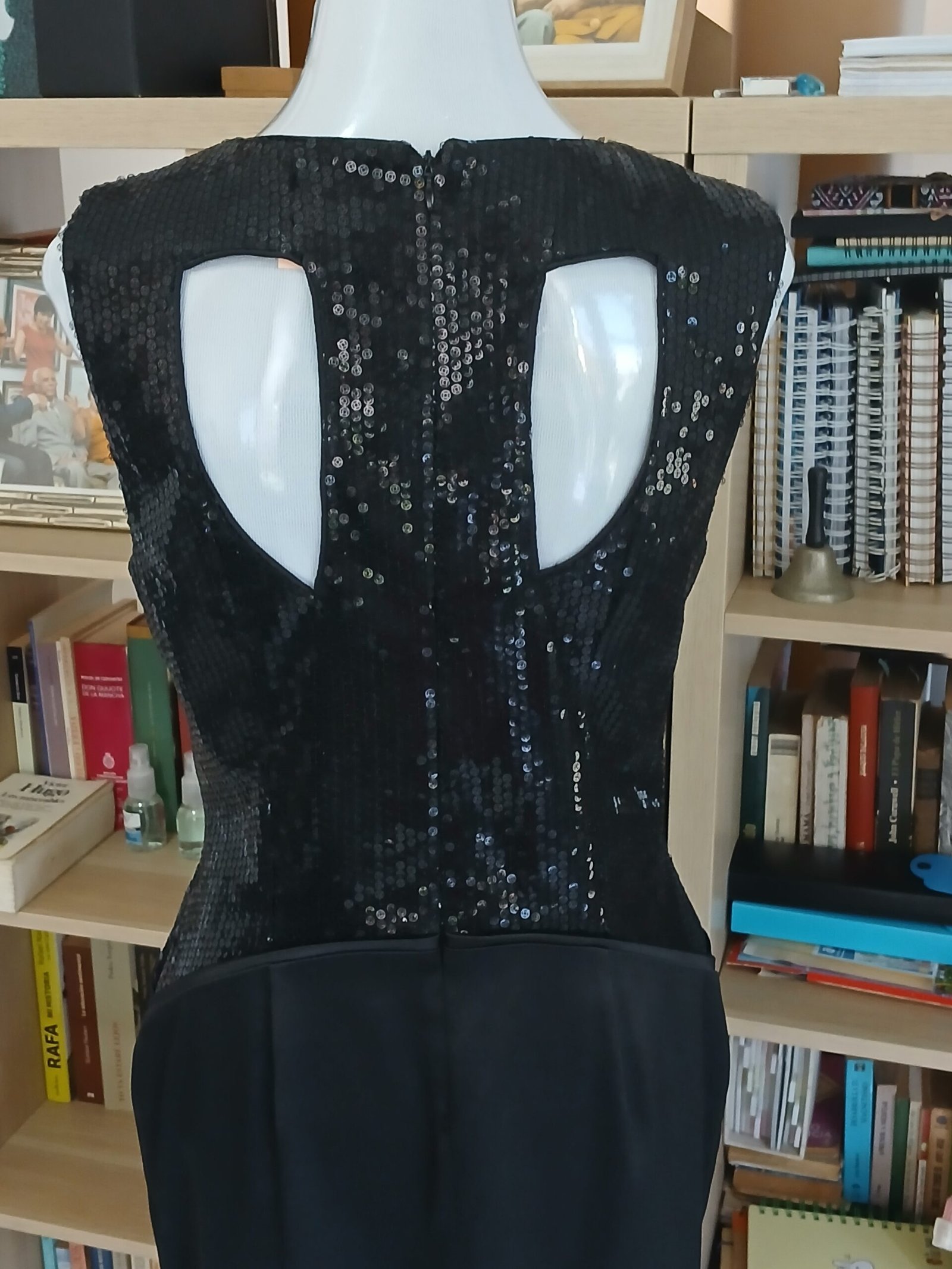 SM-VF-10-18     Vestido de Fiesta, lentejuelas y satin.  Diseño con huecos frontales a nivel de los hombres, igualmente en la parte posterior.  size 10