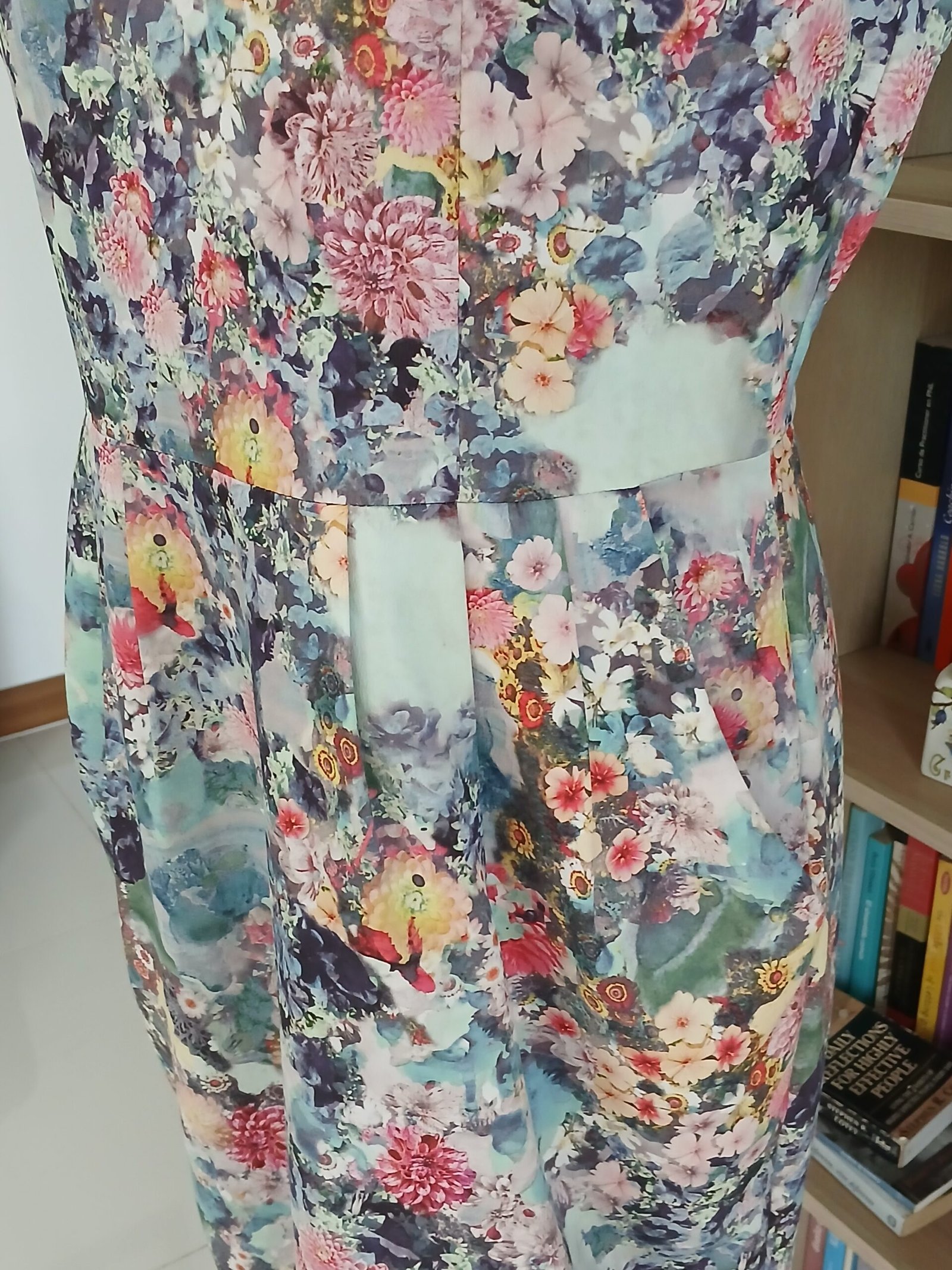 SM-VO-10-11     Vestido de oficina o cocktail, floreado, cuello en V, mangas cortas, bolsillos de ambos lados,  size 10